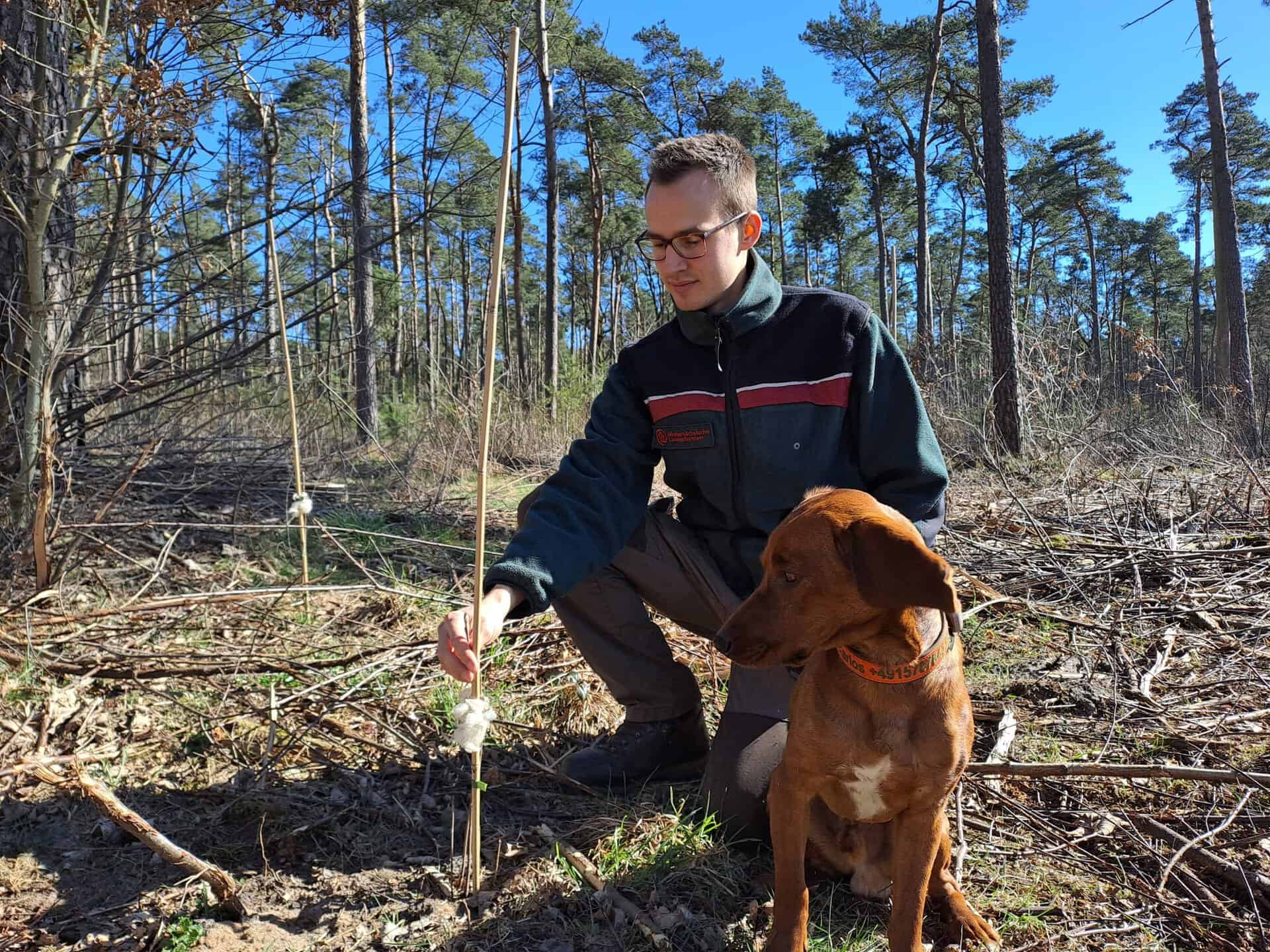 Einen besonderen Schutz für die kleinen Pflanzen hat sich Becker überlegt: Schafwolle schützt die Knospen des Haupttriebes. Zum einen kann Rehwild die Pflanzen durch die Wolle nicht verbeißen. Zum anderen hält der Wollgeruch die Tiere fern. Ein Bambusstab hilft, die Bäumchen wiederzufinden, damit sie nicht aus Versehen bei der Waldrandpflege umgeschnitten werden.