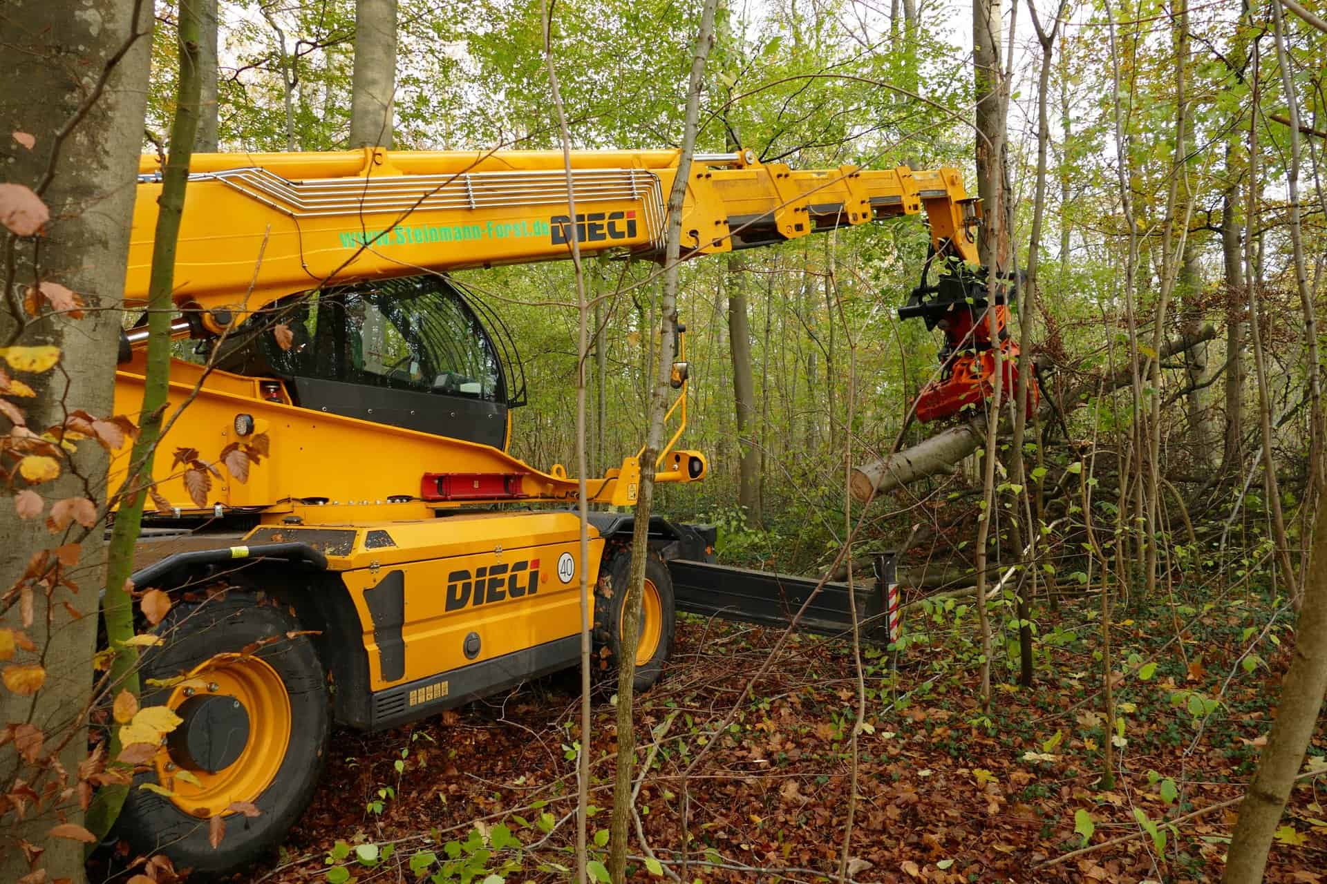 Eine Spezialmaschine entfernt trockene Baumkronen und abgestorbene Bäume. Die Arbeiten werden voraussichtlich eine Woche dauern und betreffen auch verschiedene FriedWald-Bereiche und mehrere Spazierwege.